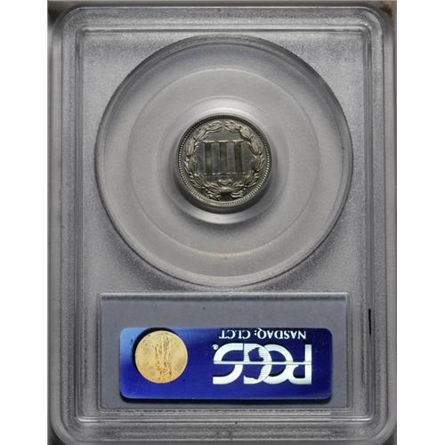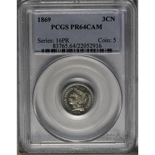 <B>1869<3CN> PR64 Cameo PCGS.</B></I> A lightly toned and attractively mirrored example. The strike is good, although the centers show a hint of weakness. A few pinpoint flyspecks are appropriate for the grade. A mere 600+ proofs were coined.
