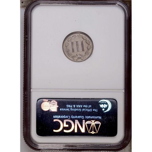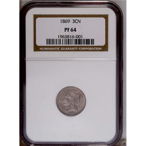 <B>1869<3CN> PR64 NGC.</B></I> Delicately layered in golden-rose patina, with no mentionable carbon on either side. Some interesting diagonal roller marks are seen on the reverse that occurred at the time of striking. <BR><BR><B>Important notice:</B> Heritage usually auctions material at the rate of 200-250 lots per hour. On some occasions eBay Live bid software or the Internet may not be able to keep up with the pace of the auction. We recommend placing a realistic absentee bid now as insurance to avoid disappointment. Occasionally the auctioneer may eliminate or reject an eBay Live bid, and the auctioneer may also reopen a lot after the close of the eBay live bidding (usually because we missed an audience bid), and may reject your bid even if it shows you as the winning bidder. By bidding via eBay Live, you agree that Heritage may award the lot to another bidder at its sole discretion under the circumstances described above or any other reasonable circumstances. Since eBay bids are not shown to us until we open the lot on the floor, we treat those bids just like floor bids. In most cases the floor responds before the eBay bid is presented to us, due to Internet lag time, so for consistency we have made it a policy that floor bids are always considered first over tie eBay live bids. Also please note that all Heritage lots purchased through eBay Live carry a 20% Buyer's Premium. Please make sure you read the Terms and Conditions before you bid. This lot is being auctioned in conjunction with a live floor auction by Heritage Galleries & Auctioneers. All final auction and invoice information will be supplied by Heritage Galleries & Auctioneers, and all other information should be considered preliminary. Lot:802 <BR><BR><B>Winning Notification and Billing:</B> After the FINAL session in this auction is complete, Heritage will send e-mail and snail mail invoices. This process normally takes several days. All final auction and invoice information will be supplied by Heritage Galleries & Auctioneers, and all other information should be considered preliminary. <BR><BR>This auction will be conducted on a live auction floor and over the Internet through eBay Live. If you choose to place an absentee bid, please take a moment to <font color='#0000ff'><u><a href='http://pages.ebay.com/liveauctions/help/before/laabsentee.html'>learn how eBay Live absentee bidding works</a></u></font><font color='#000000'>