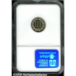 <B>1869 3CN PR65 Cameo NGC.</B></I> This sharply struck Gem exhibits good white on black contrast, and is only delicately toned in honey hues. A couple of tiny mint-made lintmarks on the neck and a few miniscule carbon flecks on the reverse field do not distract the eye. Proofs from this decade are noticeably scarcer than those from late in the series. Population: 21 in 65, 16 finer (2/05).