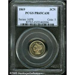 <B>1869 3CN PR65 Cameo PCGS.</B></I> Adequately struck, with a layer of light champagne patina. Seemingly devoid of mentionable marks.<BR><I>From The Mike Jacobson Collection.</B></I> Lot:5725