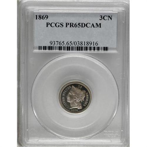 <B>1869 3CN PR65 Deep Cameo PCGS.</B></I> This specimen's impressively reflective fields are the foundation of the stark contrast displayed over both sides. The only imperfections seen over the spot-free surfaces are a few pinpoint frost breaks on the portrait, all of mint origin. Population: 14 in 65 Deep Cameo, 2 finer (6/07).<BR><BR><b>Shipping:</b> Coins & Currency (<a target="_blank" href="http://www.heritageauctions.com/common/shipping.php">view shipping information</a>\)
