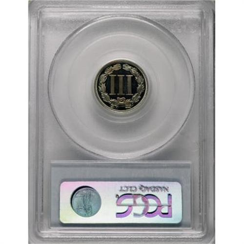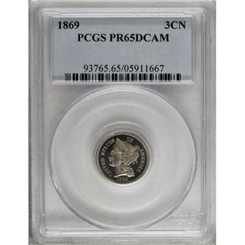 <B>1869 3CN PR65 Deep Cameo PCGS.</B></I> Both sides of this gold-washed Gem offer bold contrast, though Liberty's neck shows a few tiny luster breaks. Strongly reflective with the well-preserved surfaces required of the grade. Population: 14 in 65 Deep Cameo, 2 finer (8/07).<BR><BR><b>Shipping:</b> Coins & Currency (<a target="_blank" href="http://www.heritageauctions.com/common/shipping.php">view shipping information</a>)
