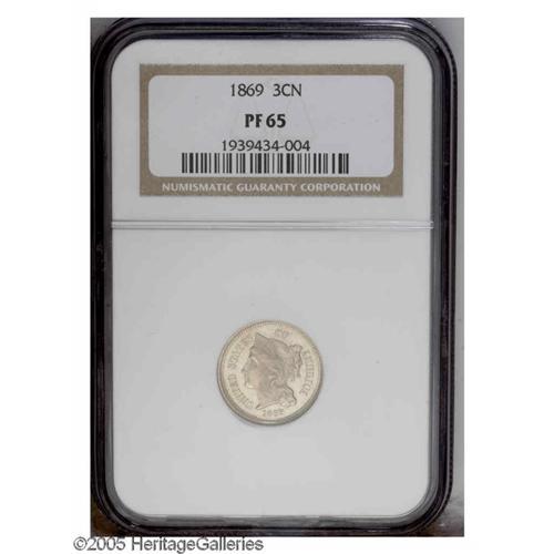 1869 3CN PR65 NGC. Golden-gray toning endows this plea 1869[3CN] PR65 NGC.