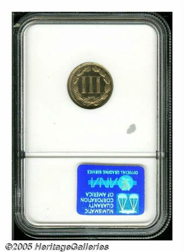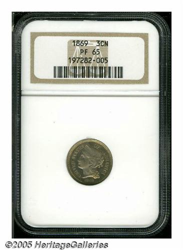 <B>1869<3CN> PR65 NGC.</B></I> Yellow-violet surfaces, particularly golden on the reverse. A number of lintmarks are noted on Liberty's portrait when closely examined.