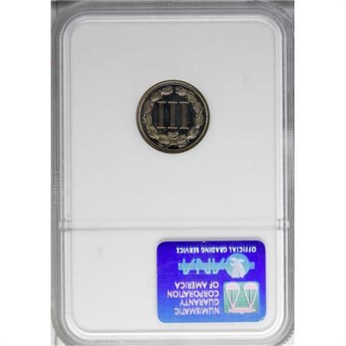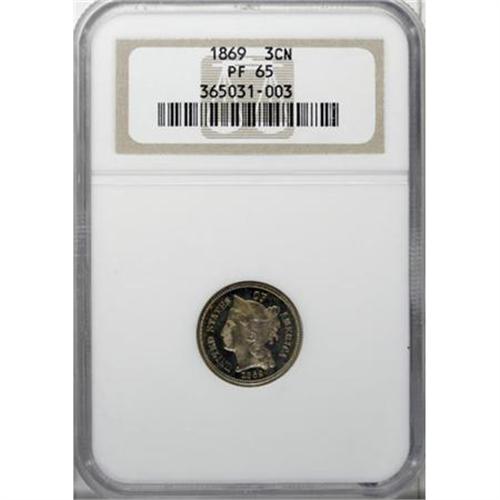<B>1869 3CN PR65 NGC.</B></I> Rich sun-gold and champagne shadings drape the shining surfaces of this three cent nickel Gem. Boldly impressed with a tiny planchet flaw on Liberty's cheek that has no effect on the grade. NGC has certified 13 finer pieces (1/08).<BR><I>From The Southwest Collection.</B></I><BR><BR><B>Coin Engraver:</B> James B. Longacre<BR><BR><b>Shipping:</b> Coins & Currency (<a target="_blank" href="http://www.heritageauctions.com/common/shipping.php">view shipping information</a>)