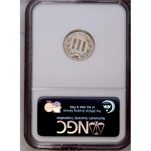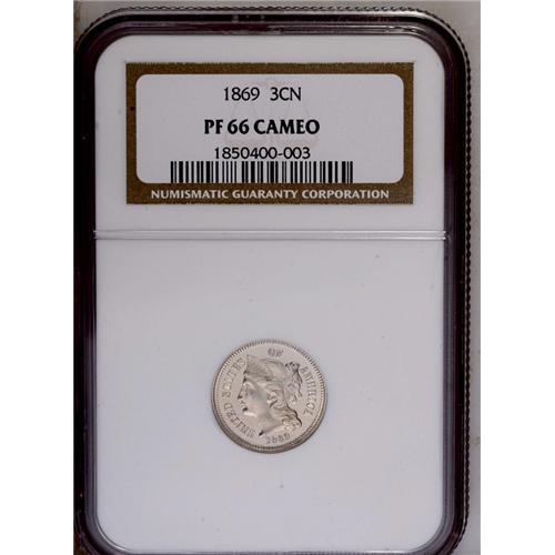 <B>1869<3CN> PR66 Cameo NGC.</B></I> Eye-popping cameo contrast is noted on both sides of this lovely Premium Gem proof. Sharply struck, as expected, with unusual and rather heavy roller marks that diagonally cross Liberty's cheek. Census: 16 in 66 Cameo, 1 finer (5/06).