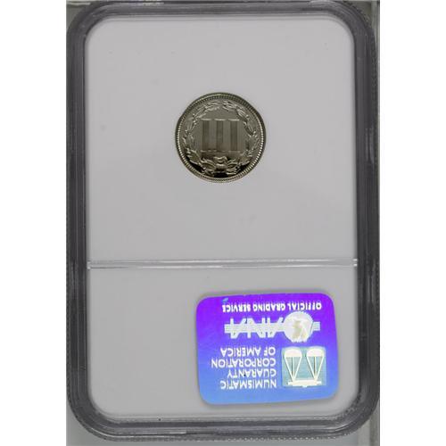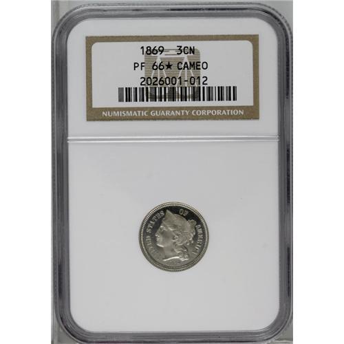 <B>1869<3CN> PR66 <img border='0' src='http://www.heritagecoins.com/images/star.gif' width=10 height=10> Cameo NGC.</B></I> The eye appeal is nothing short of breathtaking as both sides present a sharply contrasted finish and an absence of toning. The strike is razor sharp throughout, and a few shallow planchet voids and tiny lintmarks (both are as struck) are the only anomalies of note. Census: 16 in PR66 <img border='0' src='http://www.heritagecoins.com/images/star.gif' width=10 height=10> Cameo, 4 finer (3/06). <BR><BR><B>Important notice:</B> Heritage usually auctions material at the rate of 200-250 lots per hour. On some occasions eBay Live bid software or the Internet may not be able to keep up with the pace of the auction. We recommend placing a realistic absentee bid now as insurance to avoid disappointment. Occasionally the auctioneer may eliminate or reject an eBay Live bid, and the auctioneer may also reopen a lot after the close of the eBay live bidding (usually because we missed an audience bid), and may reject your bid even if it shows you as the winning bidder. By bidding via eBay Live, you agree that Heritage may award the lot to another bidder at its sole discretion under the circumstances described above or any other reasonable circumstances. Since eBay bids are not shown to us until we open the lot on the floor, we treat those bids just like floor bids. In most cases the floor responds before the eBay bid is presented to us, due to Internet lag time, so for consistency we have made it a policy that floor bids are always considered first over tie eBay live bids. Also please note that all Heritage lots purchased through eBay Live carry a 20% Buyer's Premium. Please make sure you read the Terms and Conditions before you bid. This lot is being auctioned in conjunction with a live floor auction by Heritage Galleries & Auctioneers. All final auction and invoice information will be supplied by Heritage Galleries & Auctioneers, and all other information should be considered preliminary. Lot:803 <BR><BR><B>Winning Notification and Billing:</B> After the FINAL session in this auction is complete, Heritage will send e-mail and snail mail invoices. This process normally takes several days. All final auction and invoice information will be supplied by Heritage Galleries & Auctioneers, and all other information should be considered preliminary. <BR><BR>This auction will be conducted on a live auction floor and over the Internet through eBay Live. If you choose to place an absentee bid, please take a moment to <font color='#0000ff'><u><a href='http://pages.ebay.com/liveauctions/help/before/laabsentee.html'>learn how eBay Live absentee bidding works</a></u></font><font color='#000000'>
