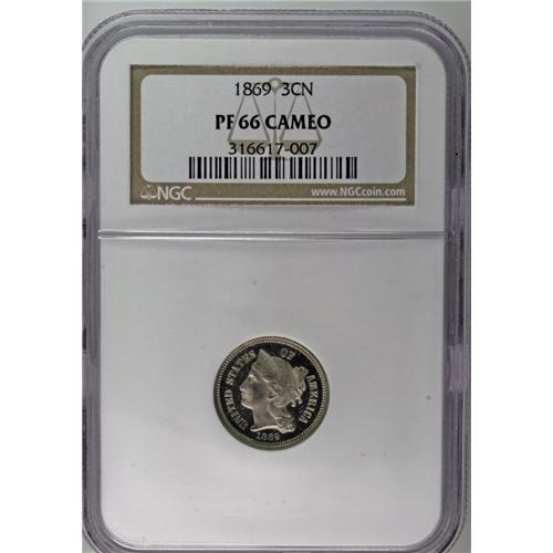 <B>1869<3CN> PR66 Cameo NGC.</B></I> This is a lovely Gem Cameo proof example with light champagne toning. Both sides have lustrous and sharply defined devices surrounded by deeply mirrored fields. Census: 21 in 66 Cameo, 4 finer (8/06).
