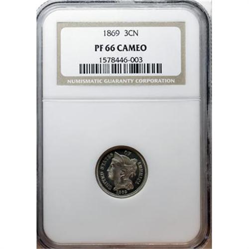 <B>1869 3CN PR66 Cameo NGC.</B></I> Essentially untoned surfaces display well impressed design elements. Both sides depict great contrast, and are well preserved. Census: 22 in 66 Cameo, 5 finer (12/07).<BR><BR><b>Shipping:</b> Coins & Currency (<a target="_blank" href="http://www.heritageauctions.com/common/shipping.php">view shipping information</a>)