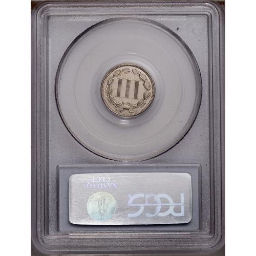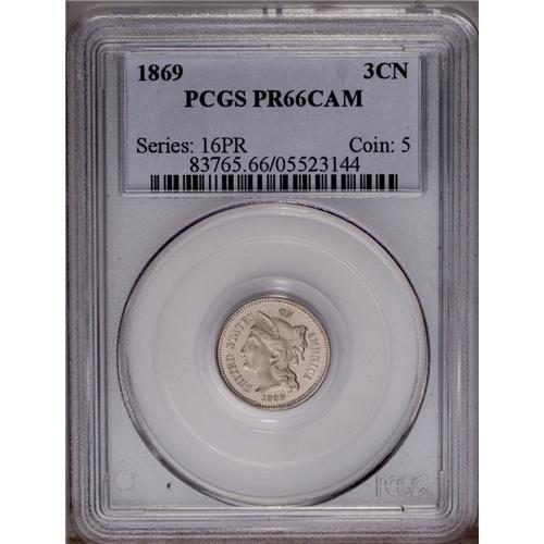 <B>1869<3CN> PR66 Cameo PCGS.</B></I> Sharply struck, untoned, and impeccably preserved. Undeniable cameo contrast is evident on each side. A few wispy striations and several curly lintmarks (as struck) are noted in the obverse and reverse fields. Population: 7 in 66 Cameo, 3 finer in Cameo condition (2/06).