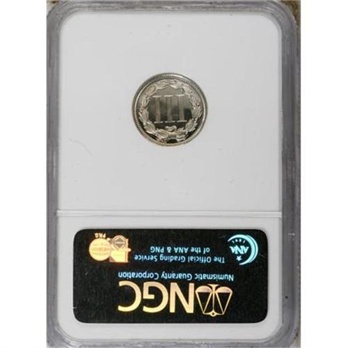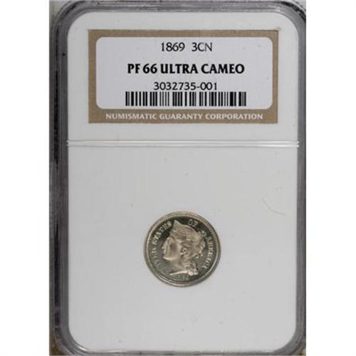 <B>1869 3CN PR66 Ultra Cameo NGC.</B></I> A boldly struck and nearly immaculate Premium Gem that boasts flashy fields and obvious white-on-black contrast. A lovely specimen of this transition-era proof issue. Census: 8 in 66 Ultra Cameo, 1 finer (8/07).<BR><BR><b>Shipping:</b> Coins & Currency (<a target="_blank" href="http://www.heritageauctions.com/common/shipping.php">view shipping information</a>)