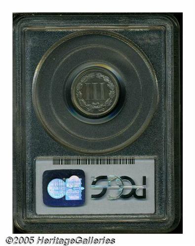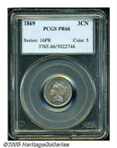 <B>1869<3CN> PR66 PCGS.</B></I> This exquisite Proof Three Cent Nickel displays an attractive melange of pastel sky-blue, orange, and lavender toning over pristine surfaces. The design features are sharply struck throughout. Population: 10 in 66, 2 finer (6/05).