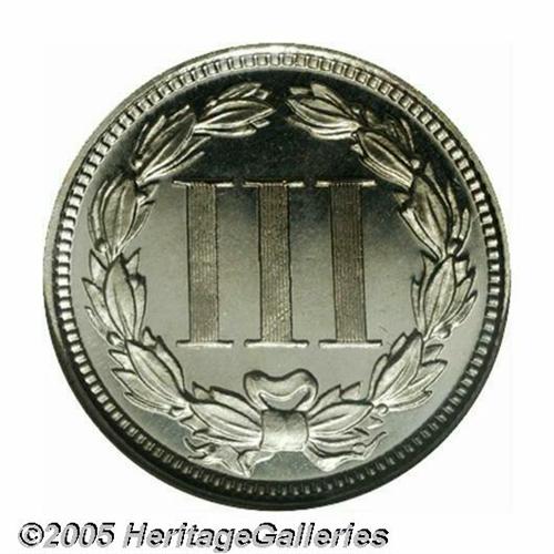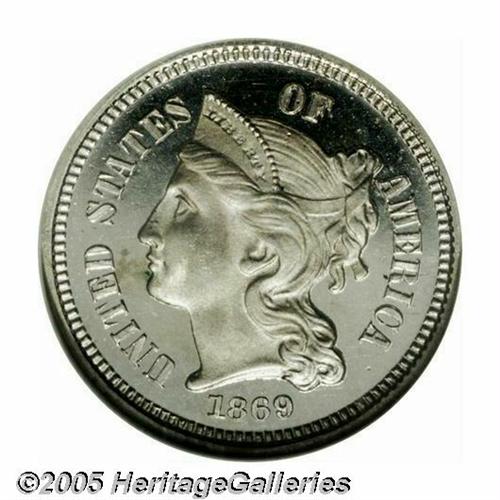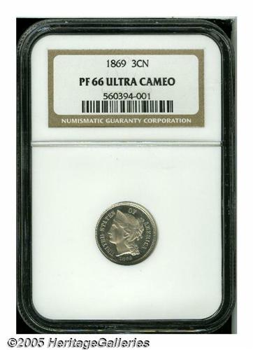 <B>1869<3CN> PR66 Ultra Cameo NGC.</B></I> The cameo contrast is both undeniable and profound. This untoned Gem is sharply struck and expectantly distraction-free for the Gem level of preservation. Population: 4 in 66, 1 finer (4/05).
