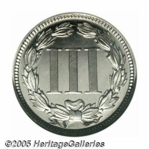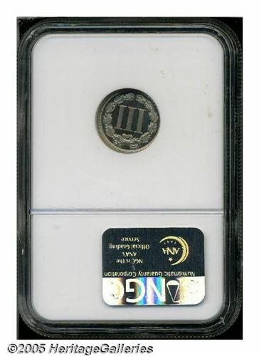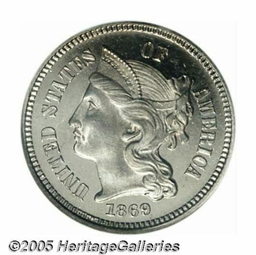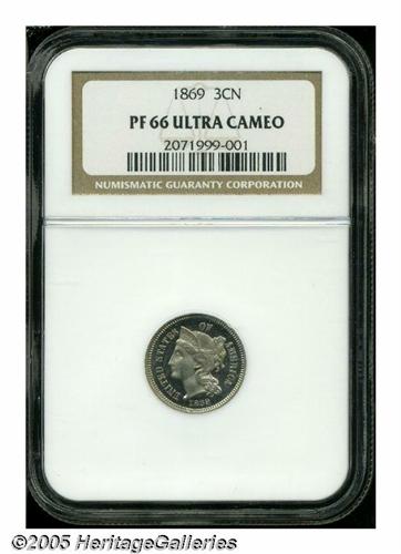 <B>1869<3CN> PR66 Ultra Cameo NGC.</B></I> The richly frosted devices and dark mirrored fields provide outstanding cameo contrast. The portrait has a few tiny planchet flakes and lintmarks, as struck, but no actual post-striking impairments seem evident. A lovely Gem proof with exceptional eye appeal. Population: 4 in 66, 1 finer (4/05).<BR><I>From The Western Hills Collection.</B></I>