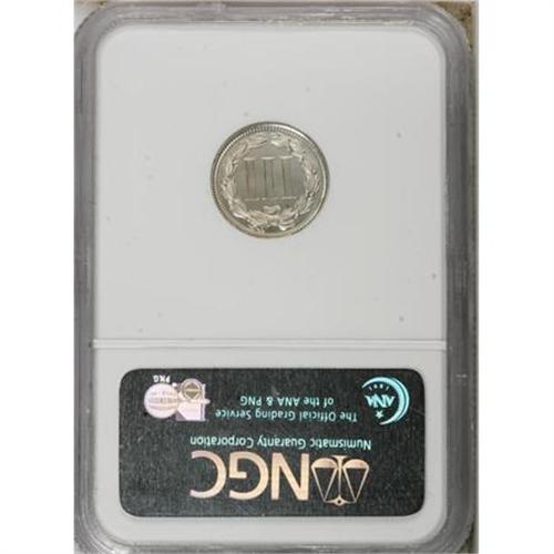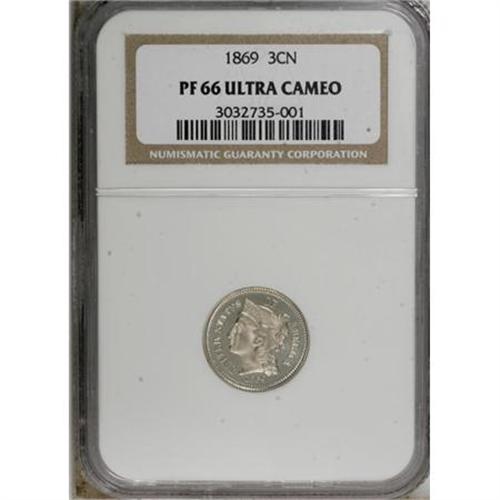 <B>1869 3CN PR66 Ultra Cameo NGC.</B></I> A boldly struck and nearly immaculate Premium Gem that boasts flashy fields and obvious white-on-black contrast. Census: 8 in 66 Ultra Cameo, 1 finer (5/07).<BR><BR><b>Shipping:</b> Coins & Currency (<a target="_blank" href="http://www.heritageauctions.com/common/shipping.php">view shipping information</a>)