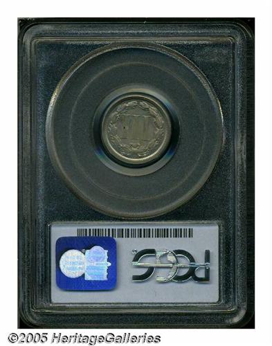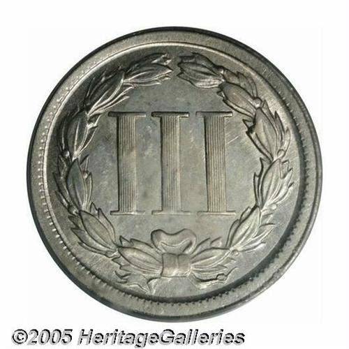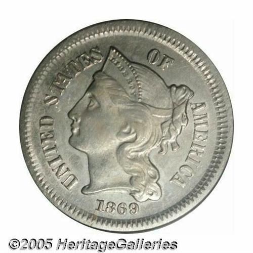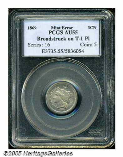 <B>1869<3CN> Three Cent Nickel--Broadstruck on a Type One Planchet--AU55 PCGS.</B></I> The rims were not upset on the planchet prior to striking, and then the coin was broadstruck, creating a double error. The broadstrike is well centered, and the surfaces are lightly toned with strong mint luster remaining.<BR><I>From The Western Hills Collection.</B></I>
