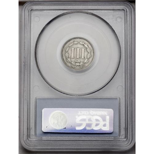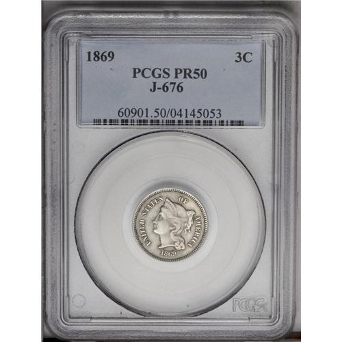 <B>1869<3CN> Three Cent Nickel, Judd-676, Pollock-753, R.4, PR50 PCGS.</B></I> Judd-676 differs in only subtle ways from the contemporary three cent nickel, so it is not surprising that a few of these patterns ended up in circulation. This ivory-gray specimen is struck in nickel with a plain edge, and only briefly entered commerce before an alert observer set it aside.