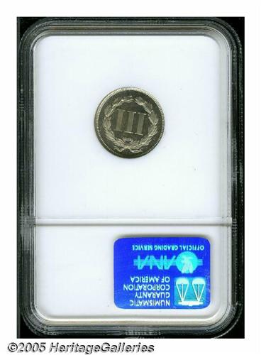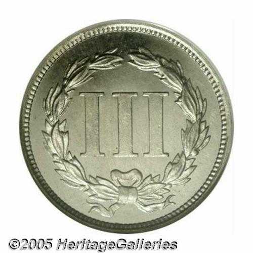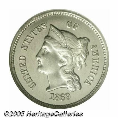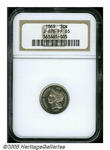 <B>1869<3CN> Three Cent Nickel, Judd-676, Pollock-753, 755, R.4, PR65 NGC.</B></I> Similar to the contemporary Three Cent Nickel design, except the date is larger and the denomination pillars are smooth. Struck in nickel with a plain edge. A thin veil of milky patina covers both sides of this well contrasted Gem.<BR><I>From The Western Hills Collection.</B></I>