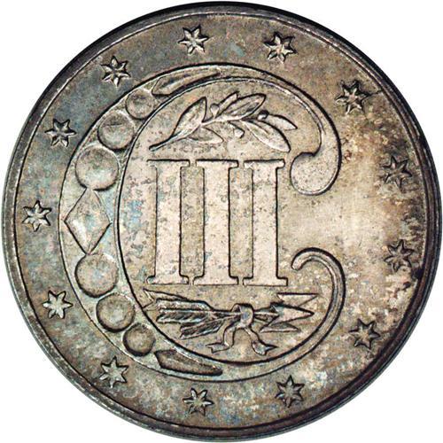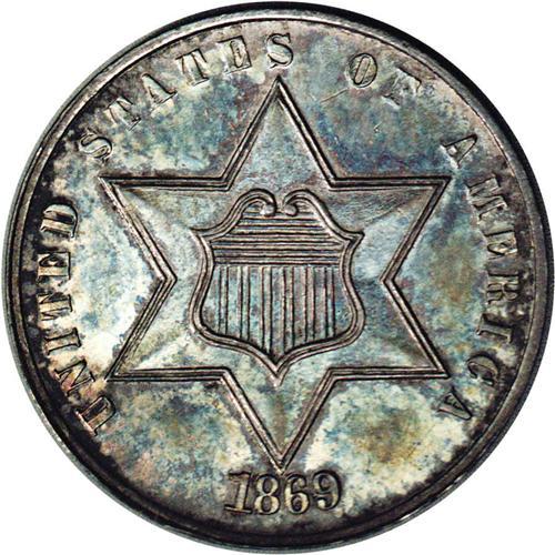 <B>1869<3CS>--Bent--NCS. Unc Details.</B></I> Sharply struck. Virtually all design features show bold definition. Both surfaces exhibit warm blue, golden-gray, and lilac toning. A desirable issue with a scant mintage of just 5,100 pieces. Envelope Included.
