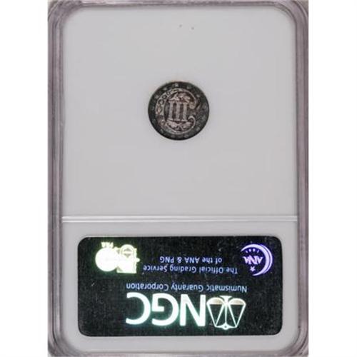 <B>1869 3CS MS63 NGC.</B></I> Deep blue-green patina in the fields cedes to silver-rose and gray at the centers. This later Select trime offers subtle luster and undeniable eye appeal. Census: 9 in 63, 29 finer (2/08).<BR><I>From The Chippewa Valley Collection.</B></I><BR><BR><B>Coin Engraver:</B> James B. Longacre<BR><BR><b>Shipping:</b> Coins & Currency (<a target="_blank" href="http://www.heritageauctions.com/common/shipping.php">view shipping information</a>)