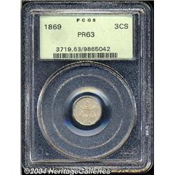 <B>1869<3CS> PR63 PCGS.</B></I> Milky gray patina embraces this boldly struck and nicely preserved specimen. A wispy mint-made lintmark beneath the M in AMERICA provides a pedigree marker. A mere 600 proofs were struck, in addition to 4,500 business strikes.<BR><I>From The Dr. Gary Hogg Collection.</B></I> <BR><BR><B>Important notice:</B> Heritage usually auctions material at the rate of 200-250 lots per hour. On some occasions eBay Live bid software or the Internet may not be able to keep up with the pace of the auction. We recommend placing a realistic absentee bid now as insurance to avoid disappointment. Occasionally the auctioneer may eliminate or reject an eBay Live bid, and the auctioneer may also reopen a lot after the close of the eBay live bidding (usually because we missed an audience bid), and may reject your bid even if it shows you as the winning bidder. By bidding via eBay Live, you agree that Heritage may award the lot to another bidder at its sole discretion under the circumstances described above or any other reasonable circumstances. Since eBay bids are not shown to us until we open the lot on the floor, we treat those bids just like floor bids. In most cases the floor responds before the eBay bid is presented to us, due to Internet lag time, so for consistency we have made it a policy that floor bids are always considered first over tie eBay live bids. Also please note that all Heritage lots purchased through eBay Live carry a 20% Buyer's Premium. Please make sure you read the Terms and Conditions before you bid.