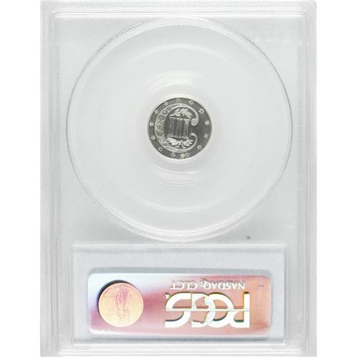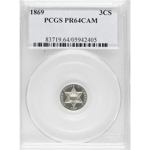 <B>1869 3CS PR64 Cameo PCGS.</B></I> This boldly struck, silver-white near-Gem proof is one of 600 such pieces coined--about one-seventh the number of business strikes produced in this year near the end of the series. The contrast is excellent, and the eye appeal is superior.<BR><BR><b>Shipping:</b> Coins & Currency (<a target="_blank" href="http://www.heritageauctions.com/common/shipping.php">view shipping information</a>)