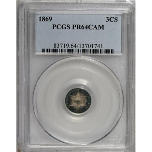 <B>1869 3CS PR64 Cameo PCGS.</B></I> Luminous bands of ocean-blue surround the pearl-gray centers of this meticulously struck near-Gem. Just 600 proofs were issued. Population: 9 in 64 Cameo, 8 finer (8/07).<BR><BR><b>Shipping:</b> Coins & Currency (<a target="_blank" href="http://www.heritageauctions.com/common/shipping.php">view shipping information</a>)
