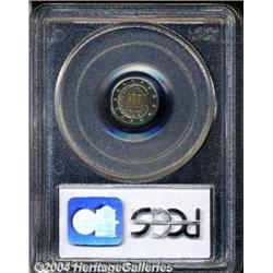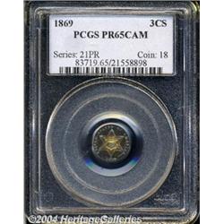 <B>1869<3CS> PR65 Cameo PCGS.</B></I> Concentric rings of sunset-golden, red, cobalt-blue, pink, and lilac equally decorate each side of this fully original Gem example. The underlying surfaces are highly reflective, the devices are somewhat frosty. There are no grade-limiting marks or hairlines worthy of mention. A clearly superior specimen worthy of a strong bid. Population: 3 in 65, 2 finer (3/04). <BR><BR><B>Important notice:</B> Heritage usually auctions material at the rate of 200-250 lots per hour. On some occasions eBay Live bid software or the Internet may not be able to keep up with the pace of the auction. We recommend placing a realistic absentee bid now as insurance to avoid disappointment. Occasionally the auctioneer may eliminate or reject an eBay Live bid, and the auctioneer may also reopen a lot after the close of the eBay live bidding (usually because we missed an audience bid), and may reject your bid even if it shows you as the winning bidder. By bidding via eBay Live, you agree that Heritage may award the lot to another bidder at its sole discretion under the circumstances described above or any other reasonable circumstances. Since eBay bids are not shown to us until we open the lot on the floor, we treat those bids just like floor bids. In most cases the floor responds before the eBay bid is presented to us, due to Internet lag time, so for consistency we have made it a policy that floor bids are always considered first over tie eBay live bids. Also please note that all Heritage lots purchased through eBay Live carry a 20% Buyer's Premium. Please make sure you read the Terms and Conditions before you bid.