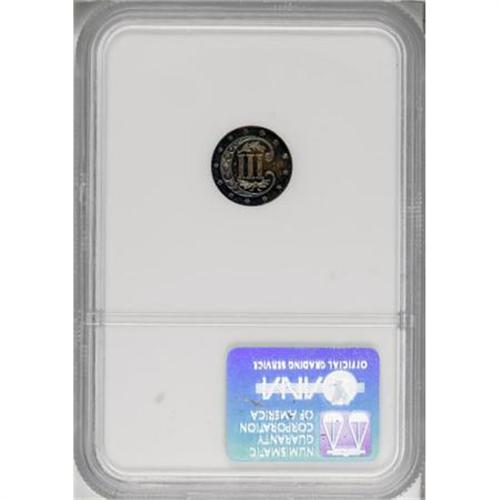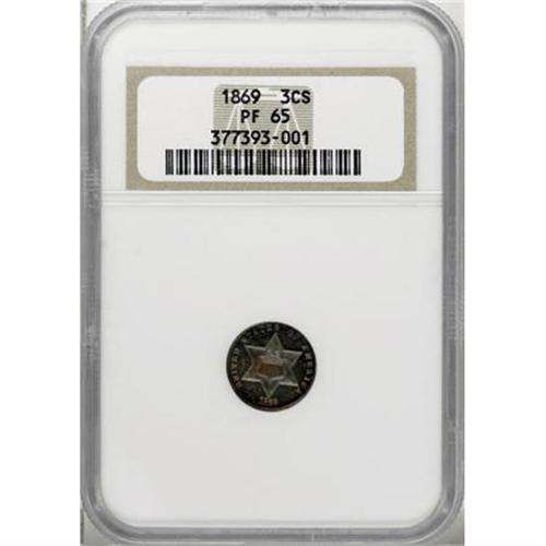 <B>1869 3CS PR65 NGC.</B></I> Just 600 proofs were struck in this year, and judging from the population figures illustrated below, few have survived at this level of preservation. This colorful Gem shows a full spectrum of electric hues, including gold, orange, lime, rose, and lavender. The design elements are sharply impressed, with no areas revealing weakness. Both sides are beautifully preserved with great eye appeal. Census: 43 in 65, 26 finer (3/08).<BR><BR><B>Coin Engraver:</B> James B. Longacre<BR><BR><b>Shipping:</b> Coins & Currency (<a target="_blank" href="http://www.heritageauctions.com/common/shipping.php">view shipping information</a>)