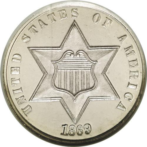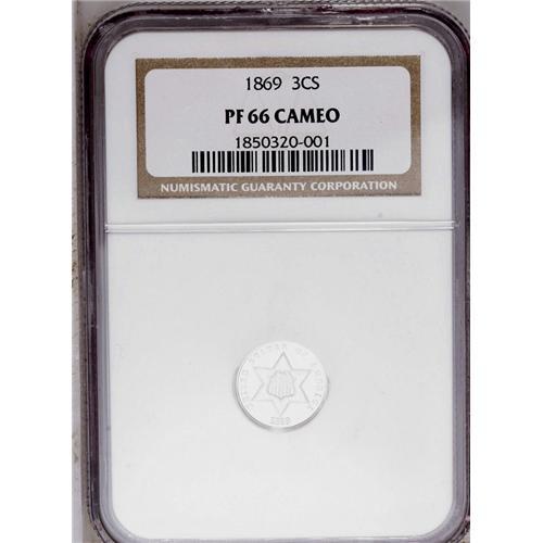 <B>1869<3CS> PR66 Cameo NGC.</B></I> Glassy fields and incredibly frosted devices make this a special Premium Gem specimen of the 1869 proof issue. Only microscopic contact marks seem evident on either side, and the dazzling reflectivity in the fields is as deep as any that we have ever seen on an example of this date. Census: 5 in 66 Cameo, 2 finer (5/06).