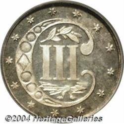 <table><tr><td><table><tr><td>1869 3CS PR66 Cameo PCGS. Mostly brilliant with only the slightest hint of color at the peripheral areas. The devices are nicely frosted resulting in a pronounced cameo effect as produced. Unmistakable as a sharp Gem example, only two other cameo specimens have thus far been graded higher at either service (both at NGC). One of the very finest of the 600 proofs struck in this year.From the Pleasant Valley Collection. <BR><BR><B>Important notice:</B> Heritage usually auctions material at the rate of 200-250 lots per hour. On some occasions eBay Live bid software or the Internet may not be able to keep up with the pace of the auction. We recommend placing a realistic absentee bid now as insurance to avoid disappointment. Occasionally the auctioneer may eliminate or reject an eBay Live bid, and the auctioneer may also reopen a lot after the close of the eBay live bidding (usually because we missed an audience bid), and may reject your bid even if it shows you as the winning bidder. By bidding via eBay Live, you agree that Heritage may award the lot to another bidder at its sole discretion under the circumstances described above or any other reasonable circumstances. Since eBay bids are not shown to us until we open the lot on the floor, we treat those bids just like floor bids. In most cases the floor responds before the eBay bid is presented to us, due to Internet lag time, so for consistency we have made it a policy that floor bids are always considered first over tie eBay live bids. Also please note that all Heritage lots purchased through eBay Live carry a 20% Buyer's Premium. Please make sure you read the Terms and Conditions before you bid. <BR><BR><B>IMPORTANT ANNOUNCEMENT ABOUT RESERVES:</B> Heritage now divulges all reserves on its web site 7 days before every auction. If you want to know whether the reserve on this lot has been met, and if not, what the reserve amount is, please visit this lot page on the HeritageCoin.com web site, or email: bid@HeritageGalleries.com </span></font></td></tr></table></td></tr></table>