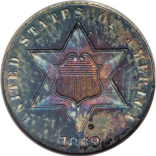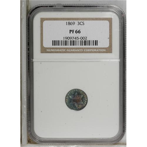 <B>1869 3CS PR66 NGC.</B></I> Deep navy-blue, orange, and ruby-red envelop this flashy and impressive specimen. The stars have needle-sharp centers, and even the shield border has only intermittent incompleteness. A small spot is noted over the 9 in the date. Another low mintage date with only 600 proofs and 4,500 business strikes. Census: 17 in 66, 8 finer (4/07).<BR><BR><b>Shipping:</b> Coins & Currency (<a target="_blank" href="http://www.heritageauctions.com/common/shipping.php">view shipping information</a>)