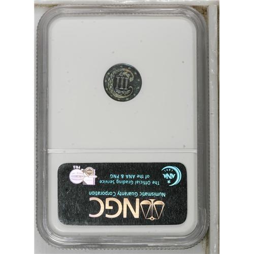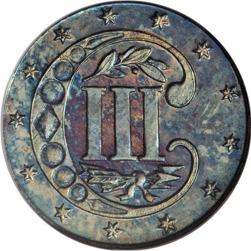1869 3CS PR66 NGC. Deep navy-blue, orange, and ruby-re
