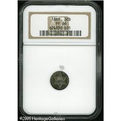 <B>1869 3CS PR66 NGC.</B></I> This low total production issue is represented by two high grade coins in this auction. This particular piece is nearly flawless and deeply reflective with varying amounts of teal and golden toning on each side. Population: 16 in 66, 8 finer (1/05). Lot:5680
