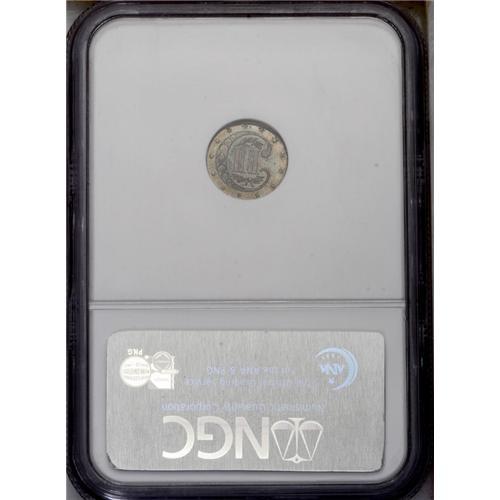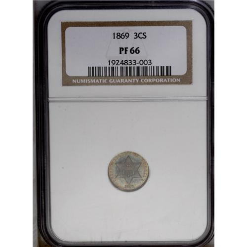 <B>1869<3CS> PR66 NGC.</B></I> Turquoise-blue toning on otherwise reflective, antique-golden fields. A strong strike for this type coin. There were only 5,100 business strikes and a mere 600 proofs produced of this date. This is one of the finest. Census: 17 in 66, 8 finer (1/06).