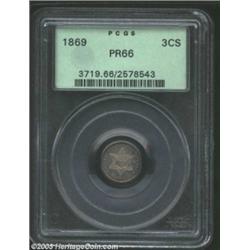 1869 3CS PR66 PCGS. Original dusky apricot patina emerges when the coin is rotated under a light. Th