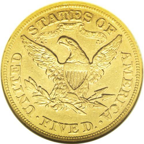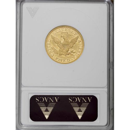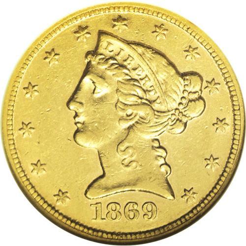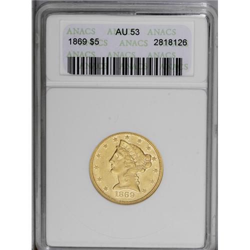 <B>1869<$5> AU53 ANACS.</B></I> The mintage of the 1869 half eagle was a paltry 1,760 pieces and it stands as one of the more desirable and collectible issues in the entire With Motto half eagle series. Adding the number of coins certified in all grades by both of the major services yields a grand total of 65 coins. Realistically speaking, that probably translates to somewhere around 35 to 45 individual coins once resubmissions are factored out. This is also a date where the collector cannot "hold out for a Gem." The finest coin certified to date (7/06) is an MS61. At the AU53 level, this piece retains noticeable portions of mint luster surrounding the devices and only minimal highpoint detail has been lost to circulation. The medium orange-gold surfaces are minimally abraded with the coin has the strong eye appeal that we have noticed the AU53 grade usually represents.