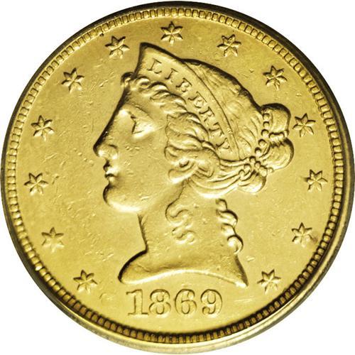 1869 $5 AU53 ICG. A mere 1,760 business strikes were c