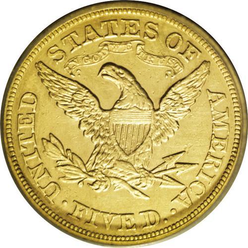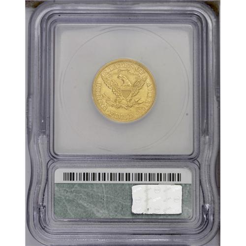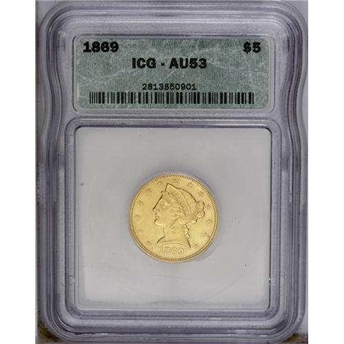 <B>1869<$5> AU53 ICG.</B></I> A mere 1,760 business strikes were coined in 1869, presumably a token production to prevent the 25 proofs issued from becoming immediately coveted rarities. Gold coins did not circulate except on the west coast during this era, removed from circulation by unbacked Federal paper money. This glossy green-gold example is nicely struck, and unpleasant marks are absent.<BR><I>From The Steve Glenn Collection.</B></I> <BR><BR><B>Important notice:</B> Heritage usually auctions material at the rate of 200-250 lots per hour. On some occasions eBay Live bid software or the Internet may not be able to keep up with the pace of the auction. We recommend placing a realistic absentee bid now as insurance to avoid disappointment. Occasionally the auctioneer may eliminate or reject an eBay Live bid, and the auctioneer may also reopen a lot after the close of the eBay live bidding (usually because we missed an audience bid), and may reject your bid even if it shows you as the winning bidder. By bidding via eBay Live, you agree that Heritage may award the lot to another bidder at its sole discretion under the circumstances described above or any other reasonable circumstances. Since eBay bids are not shown to us until we open the lot on the floor, we treat those bids just like floor bids. In most cases the floor responds before the eBay bid is presented to us, due to Internet lag time, so for consistency we have made it a policy that floor bids are always considered first over tie eBay live bids. Also please note that all Heritage lots purchased through eBay Live carry a 20% Buyer's Premium. Please make sure you read the Terms and Conditions before you bid. This lot is being auctioned in conjunction with a live floor auction by Heritage Galleries & Auctioneers. All final auction and invoice information will be supplied by Heritage Galleries & Auctioneers, and all other information should be considered preliminary. Lot:2773 <BR><BR><B>Winning Notification and Billing:</B> After the FINAL session in this auction is complete, Heritage will send e-mail and snail mail invoices. This process normally takes several days. All final auction and invoice information will be supplied by Heritage Galleries & Auctioneers, and all other information should be considered preliminary. <BR><BR>This auction will be conducted on a live auction floor and over the Internet through eBay Live. If you choose to place an absentee bid, please take a moment to <font color='#0000ff'><u><a href='http://pages.ebay.com/liveauctions/help/before/laabsentee.html'>learn how eBay Live absentee bidding works</a></u></font><font color='#000000'>