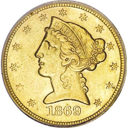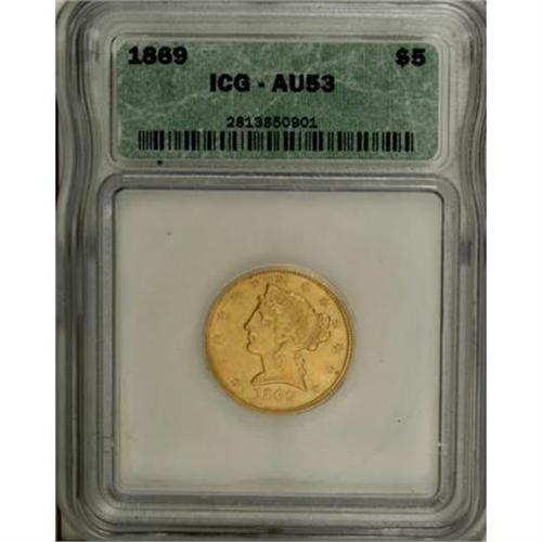 <B>1869 $5 AU53 ICG.</B></I> With gold coinage all but out of circulation across the majority of America in the wake of the Civil War, demand for such pieces was small, and Philadelphia's output of half eagles was nominal in those years. A mere 1,760 business strikes were coined in 1869 and very few are known in any grade, but this date is especially rare in AU condition. This hazy green-gold example is nicely struck, and there are no unsightly marks.<BR><BR><B>Coin Engraver:</B> Christian Gobrecht<BR><BR><b>Shipping:</b> Coins & Currency (<a target="_blank" href="http://www.heritageauctions.com/common/shipping.php">view shipping information</a>)<BR><BR><B>Important notice:</B> Heritage usually auctions material at the rate of 200-250 lots per hour. On some occasions eBay Live bid software or the Internet may not be able to keep up with the pace of the auction. We recommend placing a realistic absentee bid now as insurance to avoid disappointment. Occasionally the auctioneer may eliminate or reject an eBay Live bid, and the auctioneer may also reopen a lot after the close of the eBay live bidding (usually because we missed an audience bid), and may reject your bid even if it shows you as the winning bidder. By bidding via eBay Live, you agree that Heritage may award the lot to another bidder at its sole discretion under the circumstances described above or any other reasonable circumstances. Since eBay bids are not shown to us until we open the lot on the floor, we treat those bids just like floor bids. In most cases the floor responds before the eBay bid is presented to us, due to Internet lag time, so for consistency we have made it a policy that floor bids are always considered first over tie eBay live bids. Also please note that all Heritage lots purchased through eBay Live carry a 20% Buyer's Premium with a $9 minimum Buyer's Premium. Please make sure you read the Terms and Conditions before you bid. This lot is being auctioned in conjunction with a live floor auction by Heritage Auctions. All final auction and invoice information will be supplied by Heritage Auctions, and all other information should be considered preliminary. Lot:2551<BR><BR><B>Winning Notification and Billing:</B> After the FINAL session in this auction is complete, Heritage will send e-mail and snail mail invoices. This process normally takes several days. All final auction and invoice information will be supplied by Heritage Auctions, and all other information should be considered preliminary. <BR><BR><B>Second Chance Offers:</B> Heritage does not make Second Chance Offers. Once our auction ends, if you receive a Second Chance Offer to buy this item DO NOT accept the offer. Please forward any Second Chance offer emails received on one of our auctions to eBay's Safe Harbor Department. <BR><BR>This auction will be conducted on a live auction floor and over the Internet through eBay Live. If you choose to place an absentee bid, please take a moment to <font color='#0000ff'><u><a href='http://pages.ebay.com/liveauctions/help/before/laabsentee.html'>learn how eBay Live absentee bidding works</a></u></font><font color='#000000'>