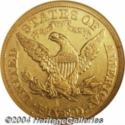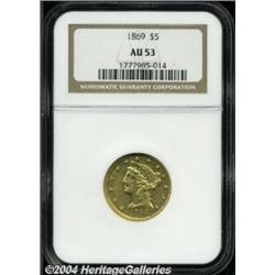 <B>1869<$5> AU53 NGC.</B></I> The 1869 half eagle boasts an original mintage of only 1,785 pieces and, as such, it is one of the rarest issues of the denomination. The typical survivor is apt to grade no finer than XF/AU. This bright yellow-gold example generally reveals nice detail, save for weakness in some of Liberty's hair curls, and in the feathers on the eagle's neck. The surfaces are lightly abraded, but a slightly more noticeable mark is seen on Liberty's cheek. <BR><BR><B>Important notice:</B> Heritage usually auctions material at the rate of 200-250 lots per hour. On some occasions eBay Live bid software or the Internet may not be able to keep up with the pace of the auction. We recommend placing a realistic absentee bid now as insurance to avoid disappointment. Occasionally the auctioneer may eliminate or reject an eBay Live bid, and the auctioneer may also reopen a lot after the close of the eBay live bidding (usually because we missed an audience bid), and may reject your bid even if it shows you as the winning bidder. By bidding via eBay Live, you agree that Heritage may award the lot to another bidder at its sole discretion under the circumstances described above or any other reasonable circumstances. Since eBay bids are not shown to us until we open the lot on the floor, we treat those bids just like floor bids. In most cases the floor responds before the eBay bid is presented to us, due to Internet lag time, so for consistency we have made it a policy that floor bids are always considered first over tie eBay live bids. Also please note that all Heritage lots purchased through eBay Live carry a 20% Buyer's Premium. Please make sure you read the Terms and Conditions before you bid. </span></font></tr></table></td></tr></table>