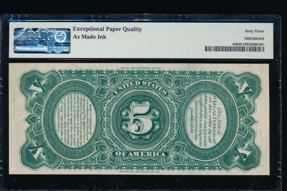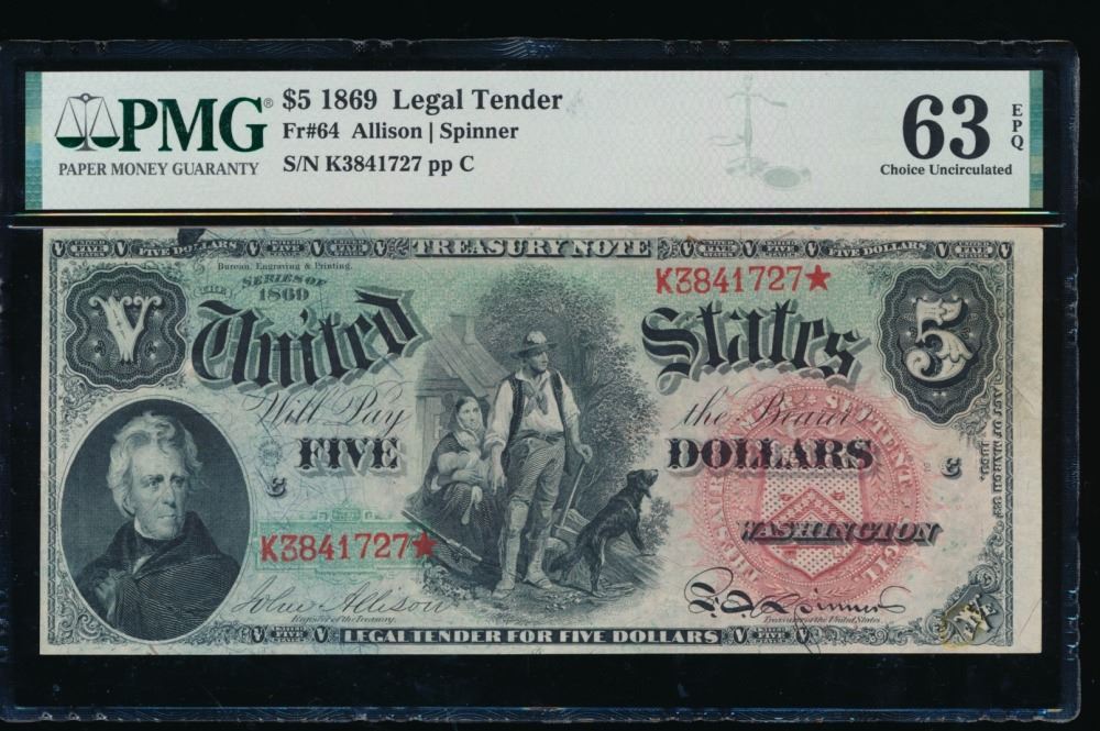 One 1869 $5 Legal Tender Note PMG 63EPQ.
