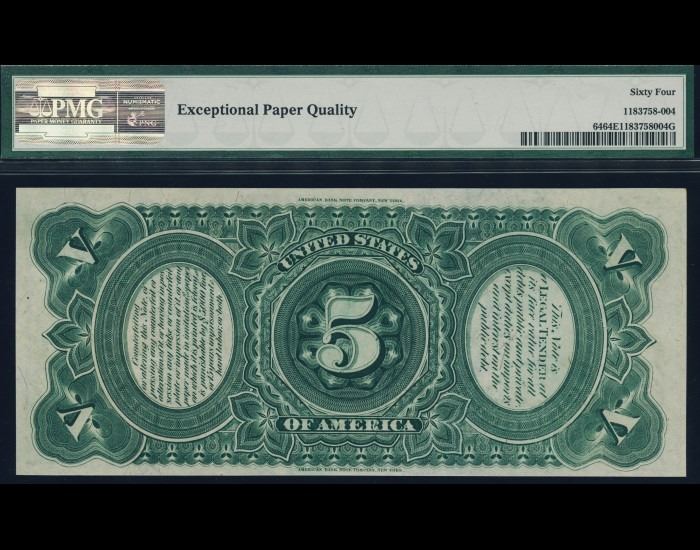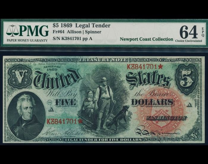 One 1869 $5 Legal Tender Note PMG 64EPQ.