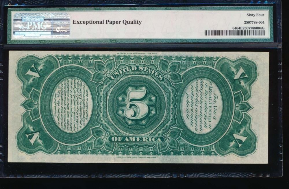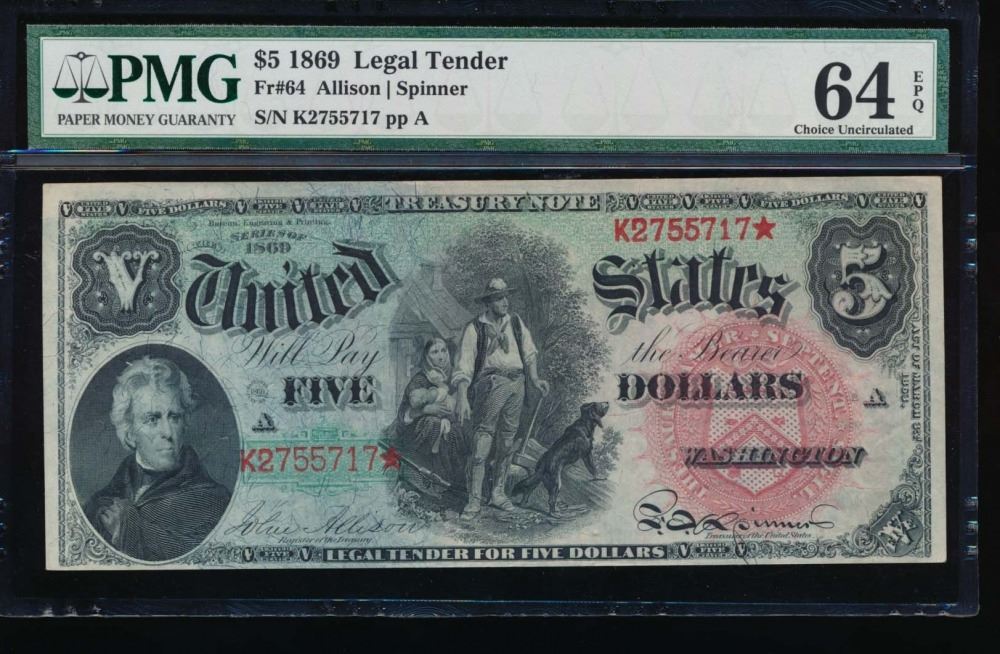 One 1869 $5 Legal Tender Star Note PMG 64EPQ.