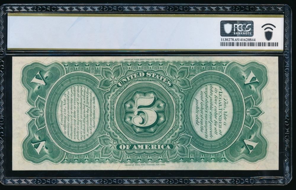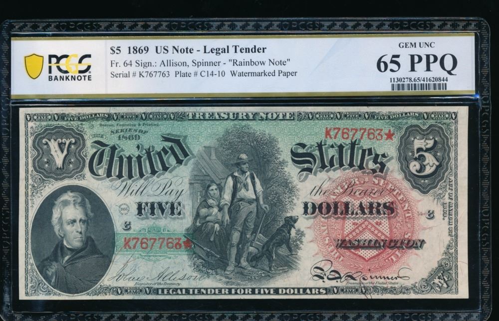 One 1869 $5 Rainbow Legal Tender Note PCGS 65PPQ.