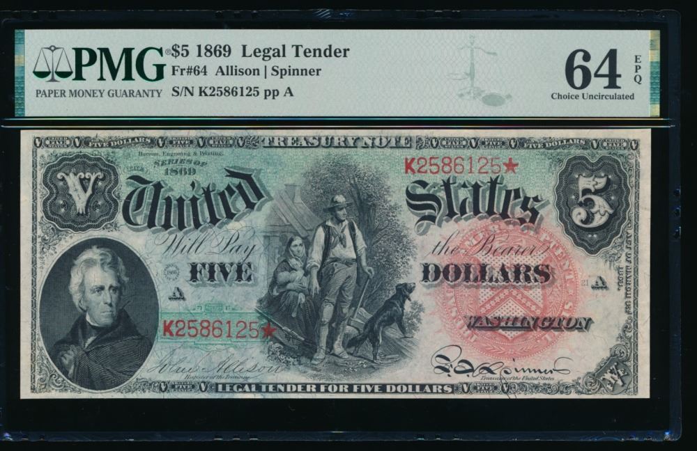 One 1869 $5 Rainbow Legal Tender Note PMG 64EPQ.