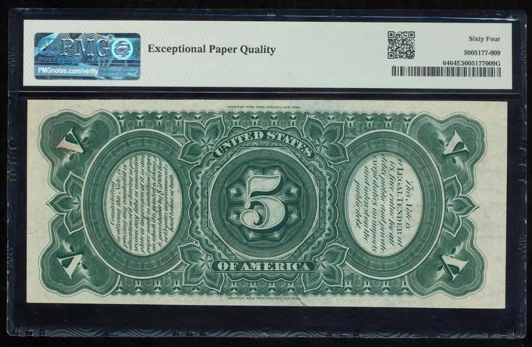 One 1869 $5 Rainbow Legal Tender Note PMG 64EPQ.