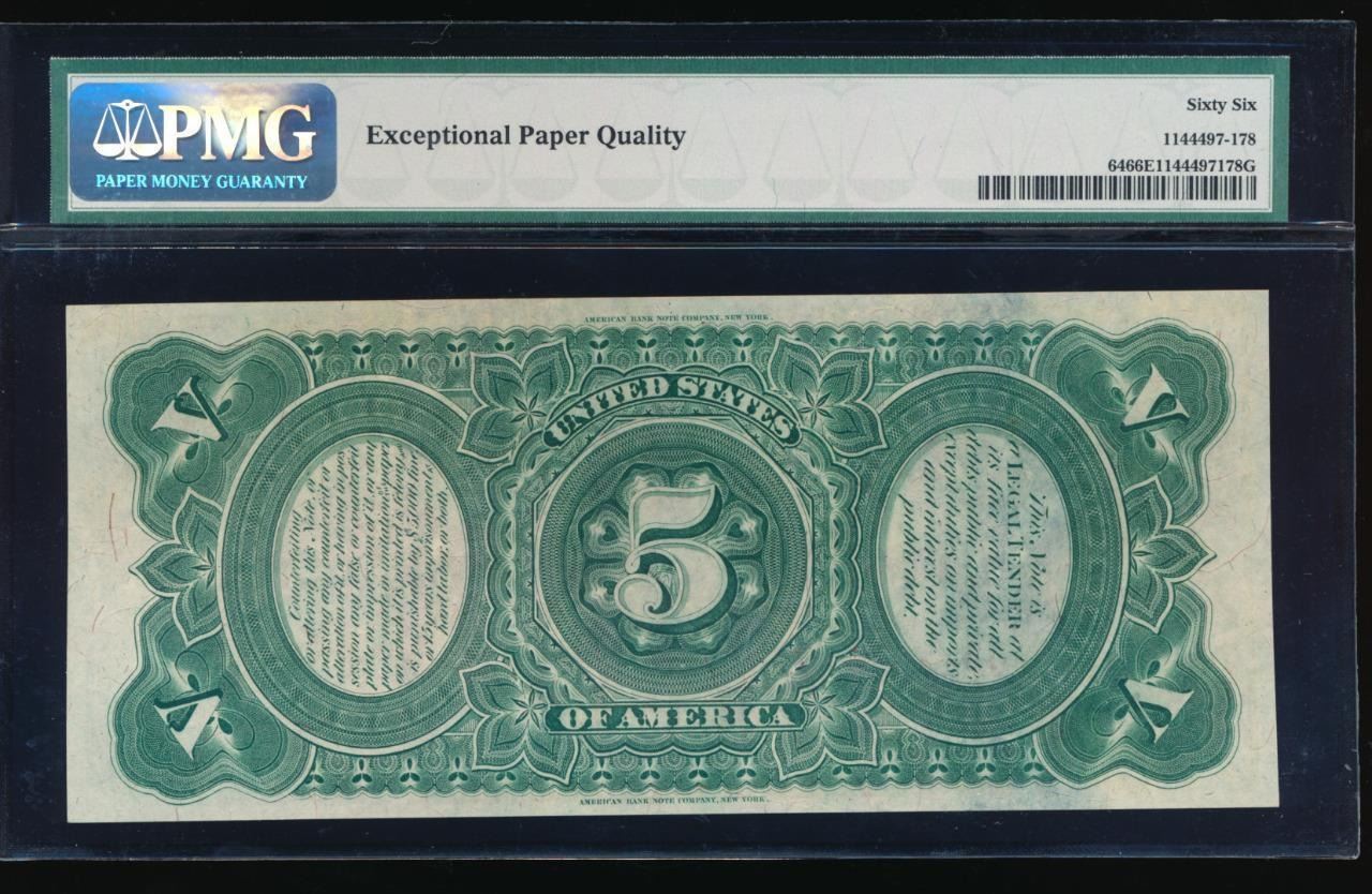 One 1869 $5 Rainbow Legal Tender Note PMG 66EPQ.
