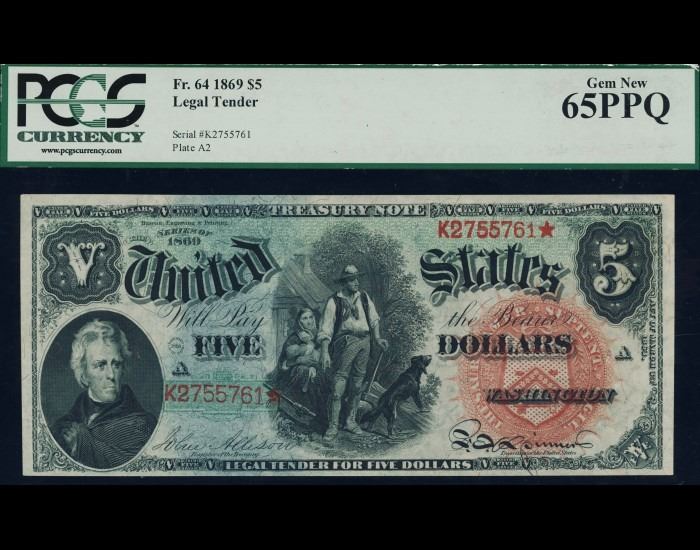 One 1869 $5 Rainbow Legal Tender PCGS 65PPQ.
