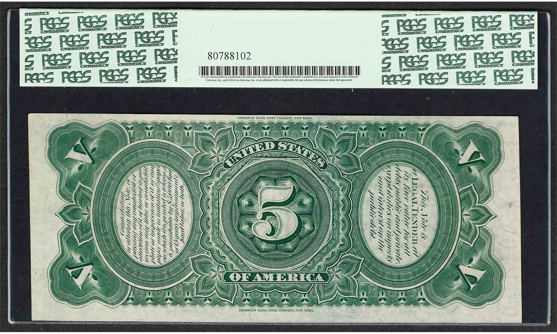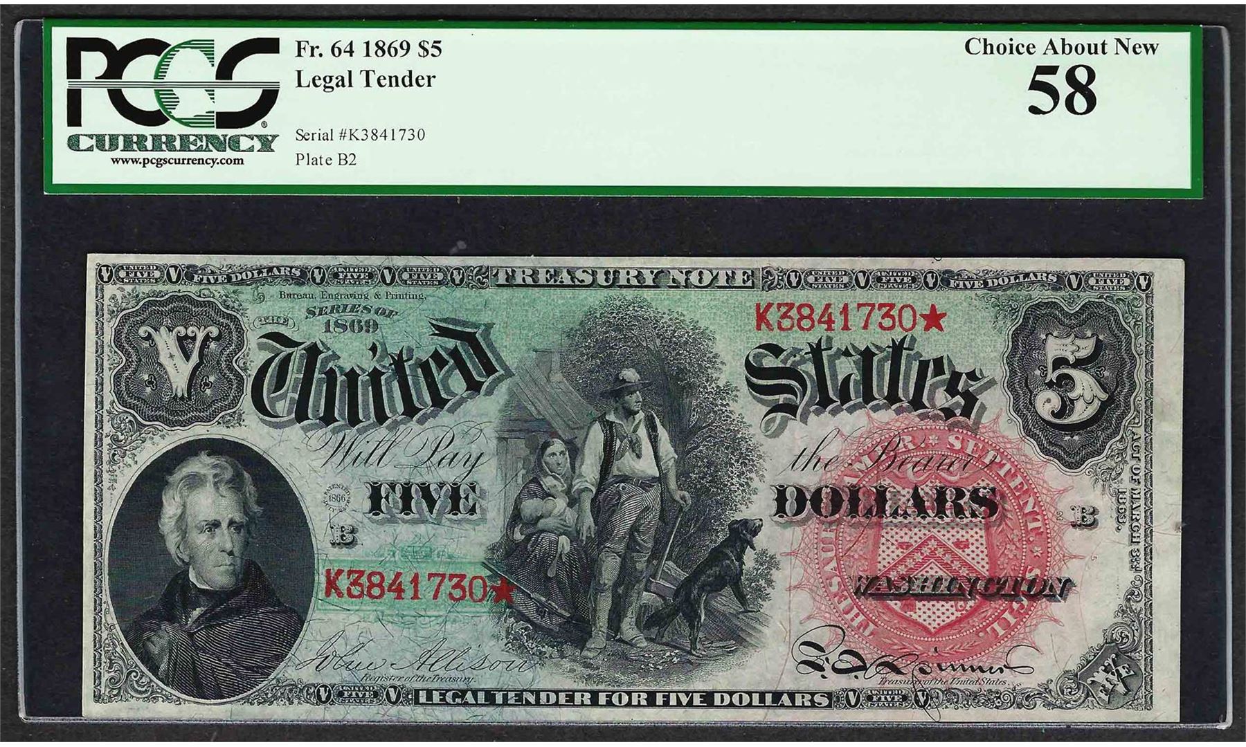 One 1869 $5 Rainbow Woodchopper Legal Tender Note Fr.64 PCGS Choice About New 58. PCGS Graded.